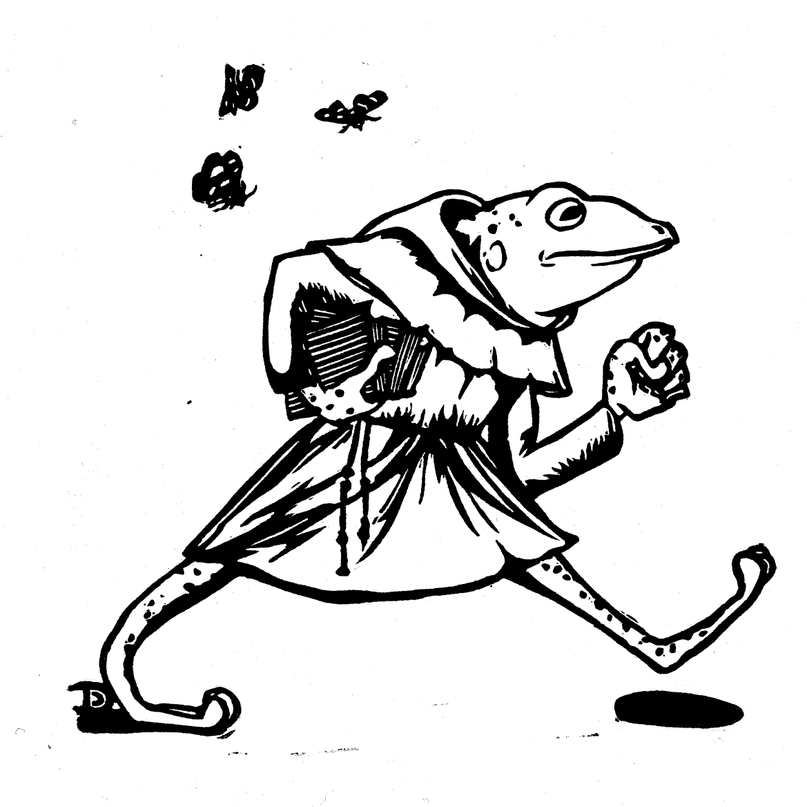 Davey makes woodcut and linocut art inspired by Dutch Golden Age painting, medieval manuscripts, and frogs.