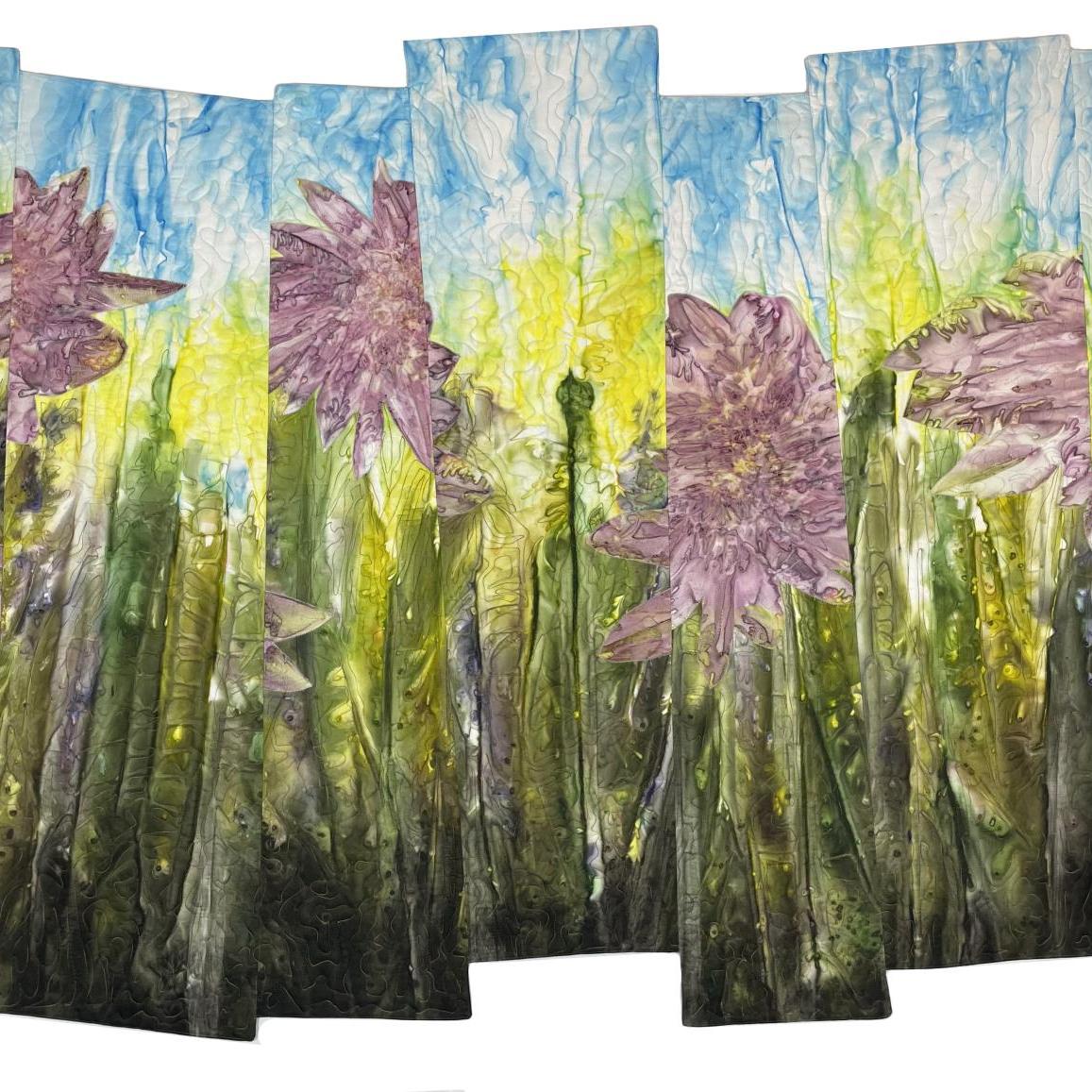 Textile artist Teri McHale paints, rusts, layers, stitches, and shapes silk to create suggestions of landscapes closeups of natural forms, and vessels.