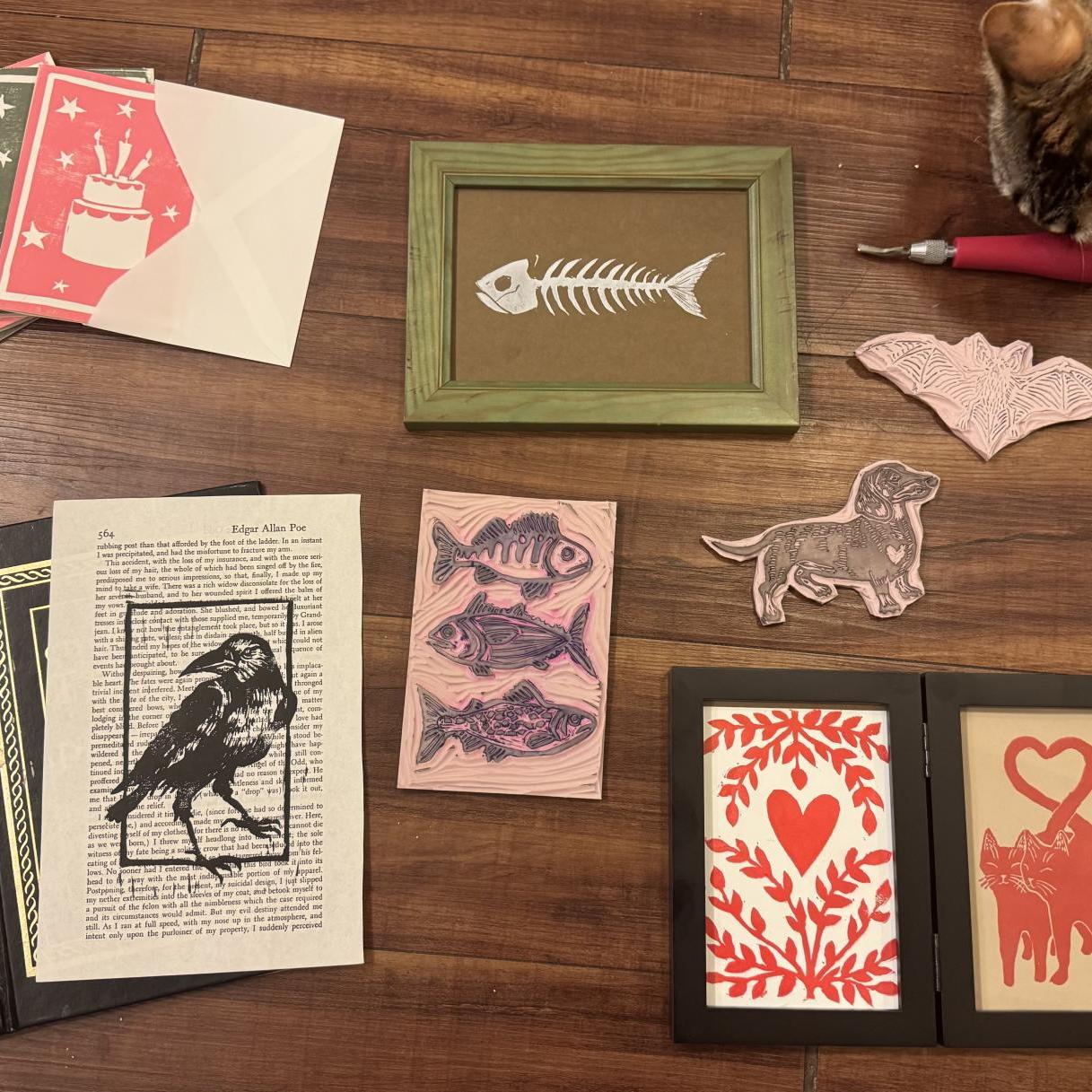 Arts and crafts enthusiast, Hailey, creates clever and unique linocut prints. They print on cards, tote bags, upcycled clothes, and stickers.