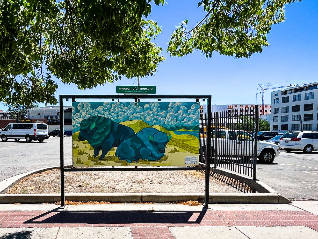 Analia Evans’ piece, for instance, captures the bison that call Antelope Island home, though it’s really not much of an island anymore because of the shrinking lake. The changes to lake levels pose issues to the animals who live on Antelope Island — and the other islands in the lake.